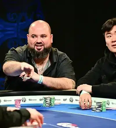 Mies istuu mustassa hupparissa ja mustassa lippalakissa vihreän pöydän äärellä. Taustalla näkyy useita ihmisiä.