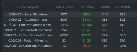 Oon noin parikymmentä vuotta lätkinyt korttia ja mulla ei ole oikeastaan mitään näyttöä peleistä, tai isompaa databasea. Joten haluan nähdä taso tasolta myös winrateni ja mahdolliset ROI.t