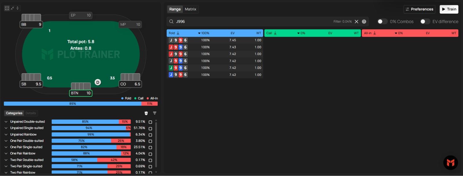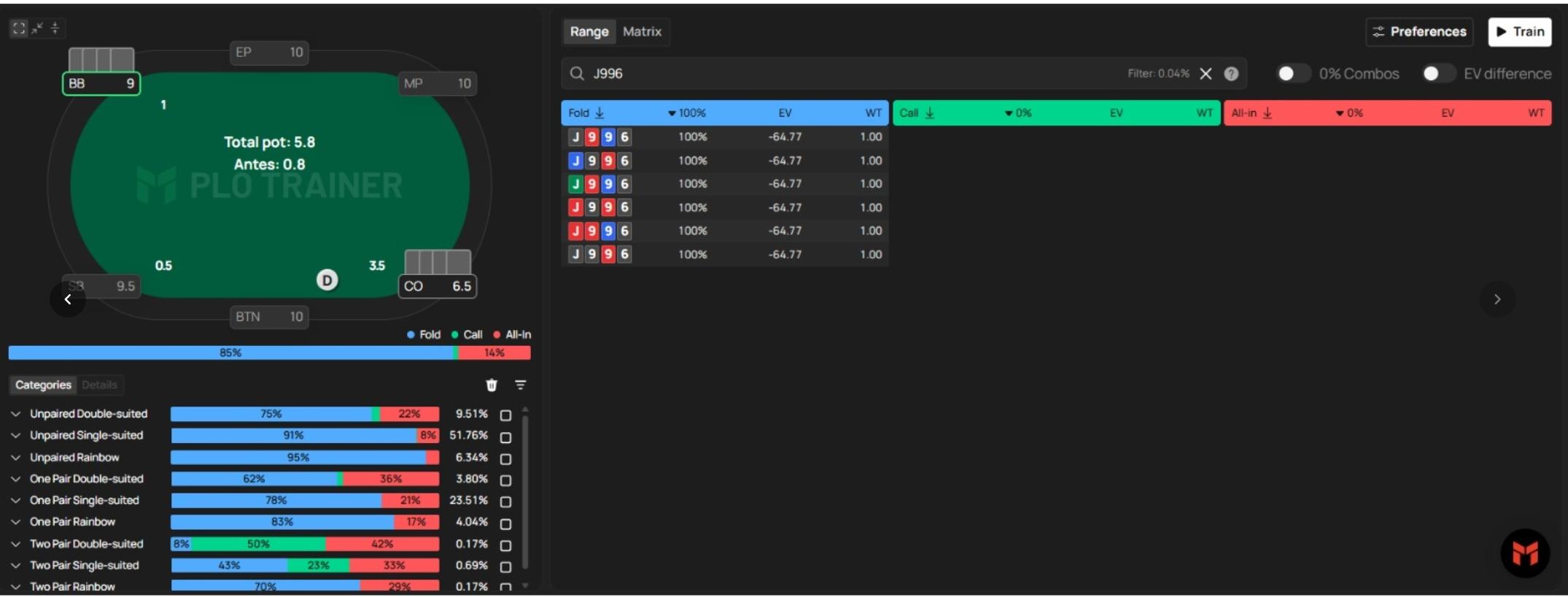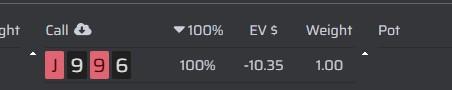 Foldin ja maksun ero on aika marginaalinen, toki jos kaikkien pelaajien ranget ovat solverin olettamia, maksu on lievästi parempi. Toki myös postflop pitää pelata täydellisesti.