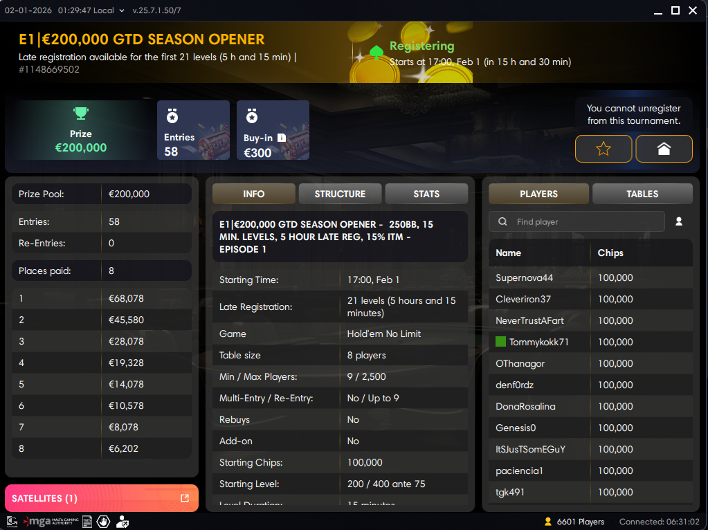 Kaikkein typerintä on toki se, että esimerkiksi satasen PKO:ssa oli 15 tason latereg. Ekat 10 tasoa kestivät 15 minuuttia, seuraavat 5 tasoa 10 minuuttia ja lateregin päätyttyä siirryttiin turbomoodiin eli 8 minuutin tasoihin. Muuallahan nuo menevät yleensä toisinpäin, turnaus hidastuu kun aletaan pelata palkinnoista.