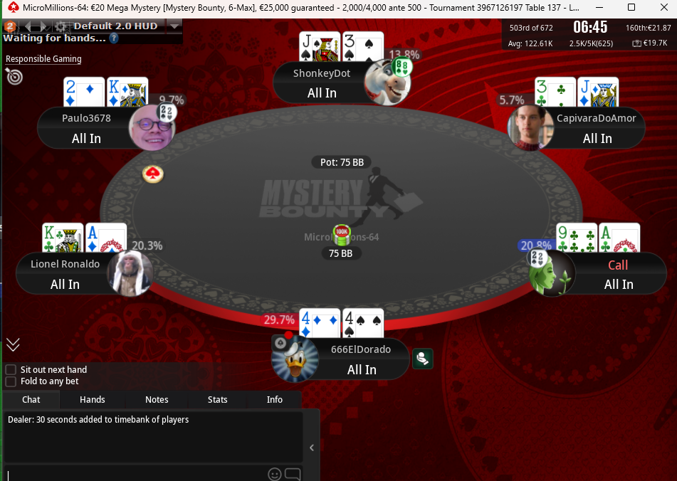 Siinä päivän ainoa pytty. Tiukassa on kyllä kunnon osumat tai edes sivuosumat. Isot pelit eli 150 satla, 50 satla ja 70€ flipclusive tunkahtivat, 10€ PLO R/A-pelissä rysähdettiin bubblella (myös FT-bubble), 5 R/A putosi sijalla 4 satasen jämärahoilla, 10€ PLO8 R/A mikrofieldillä jäi kakkoseksi. Pikkusatloista sentään jollain 600 eurolla lippuja.Varmaan about breikkiin tai vähän voitolle rahallisesti. Lisäksi turnauslippujen määrä kasvoi 400 eurolla.