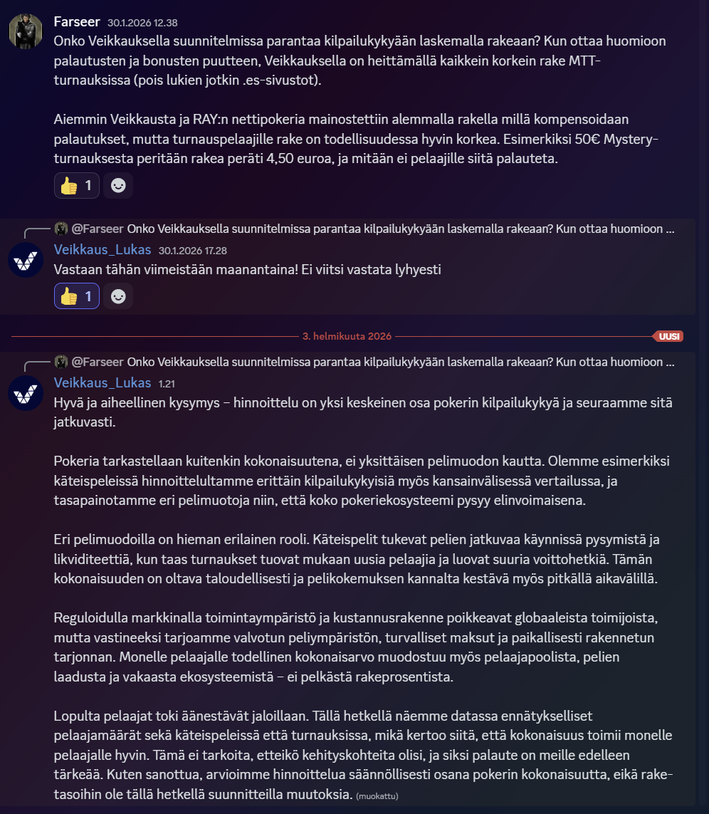 FarseerOsallistujaLaitetaan nyt myös tänne se syy (toki Veikkauksen aiemman politiikan ja kieltolain ajamisen suhteen) miksi itse haluaisin kaikkien boikotoivan Veikkauksen turnauksia. Pistin aiheesta palautetta myös Veikkauksen discordiin, mutta tuskinpa he sitä lukevat.