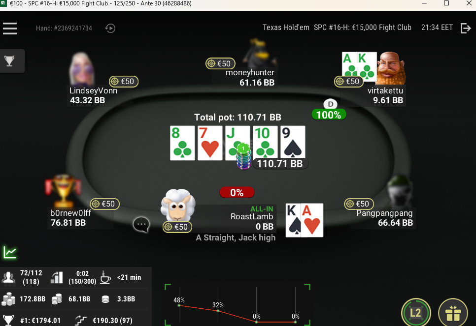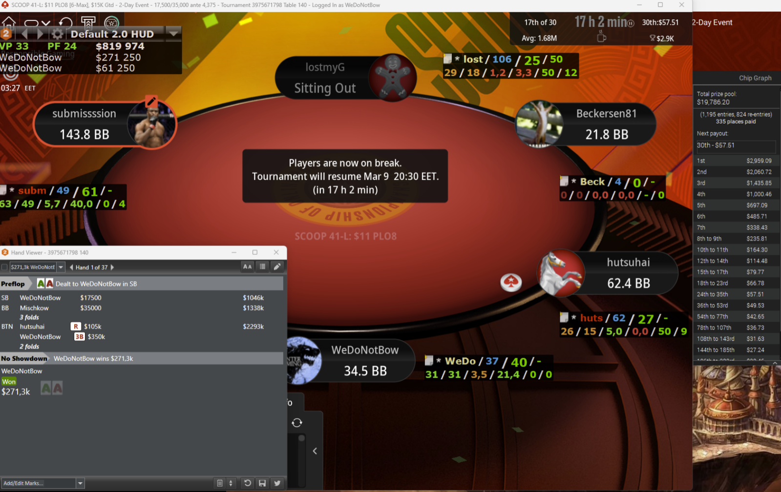 Turnaussarjat tosiaan kosahtaneet pahasti, etenkin juuri ne isoimmat. Yksi 50€ turtsi meni finuun mut bustas heti ekana sijalla 6, joten isot pelit taas satlaa lukuun ottamatta kuopanneet. Keskisarjaa jatkan vielä kun yksi 2. sija ja kasa pienempiä pistesijoja pitää mukana LB-skabassa.