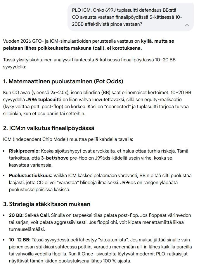 OsallistujaLisäks kannattaa kyseisissä käsissä miettiä myös muutakin kuin automaatio deffausta kuplassa. Sillä turnauksen jatkollaki on merkitystä, sä et halua marginaalispoteilla tuplata itseäsi parempaa tai hyvää pelaajaa koska se vaikeuttaa sun turnauksen jatkoa finaalissa.