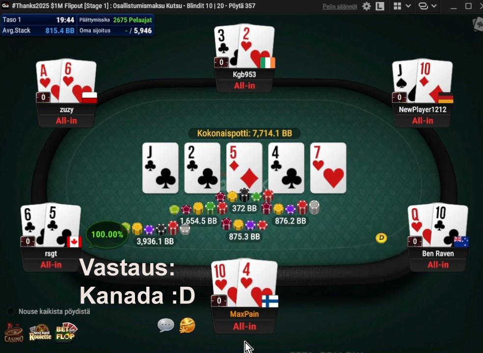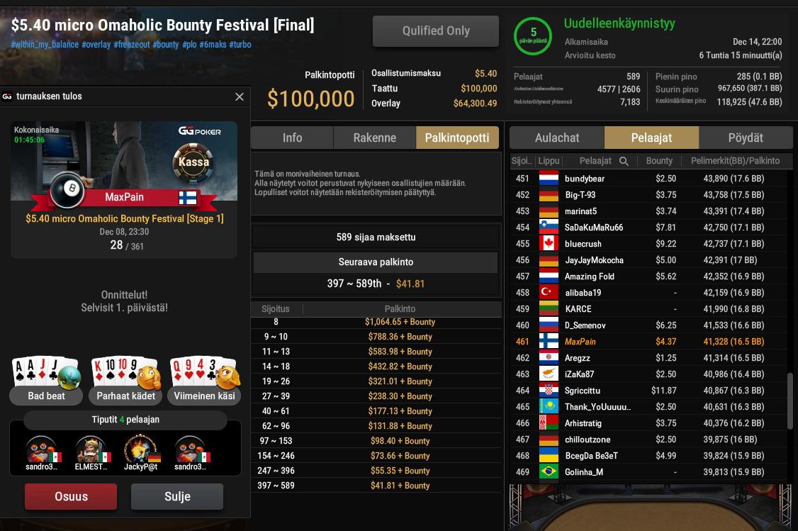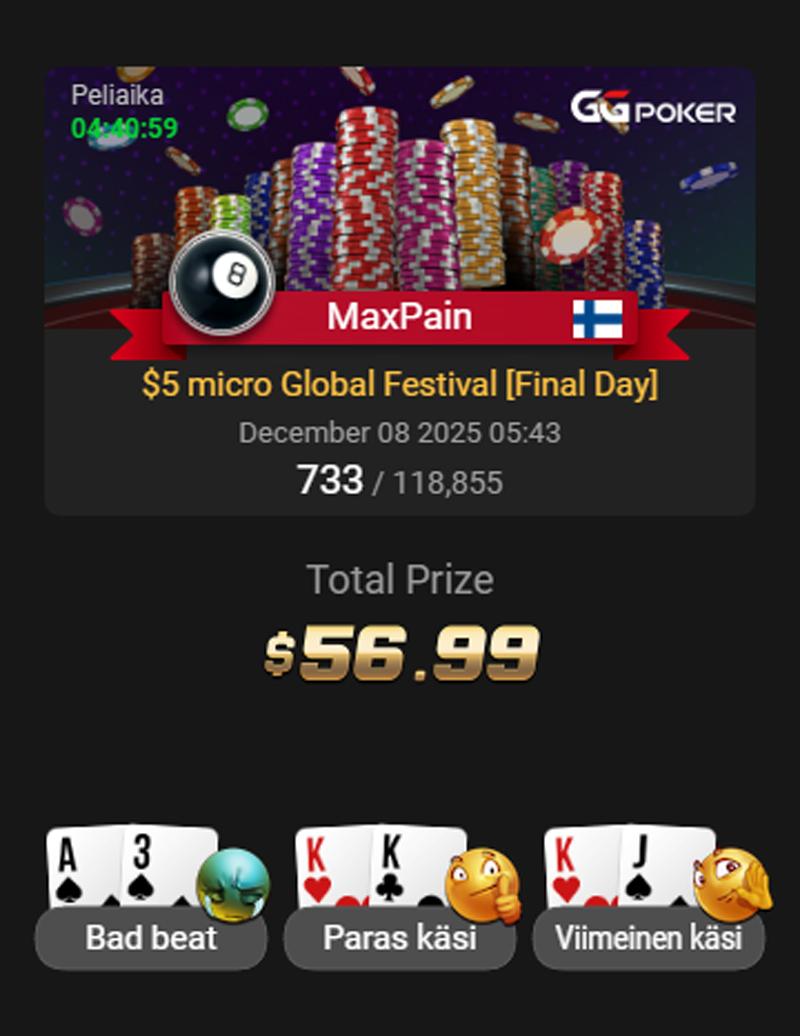Sunnuntain Micro festival 500k meni.. ks. Kuva ja nyt tänään pääsin toiselle päivälle omppu 100k turnees. Pikku stäck vain, mutta rahasija taas varma.