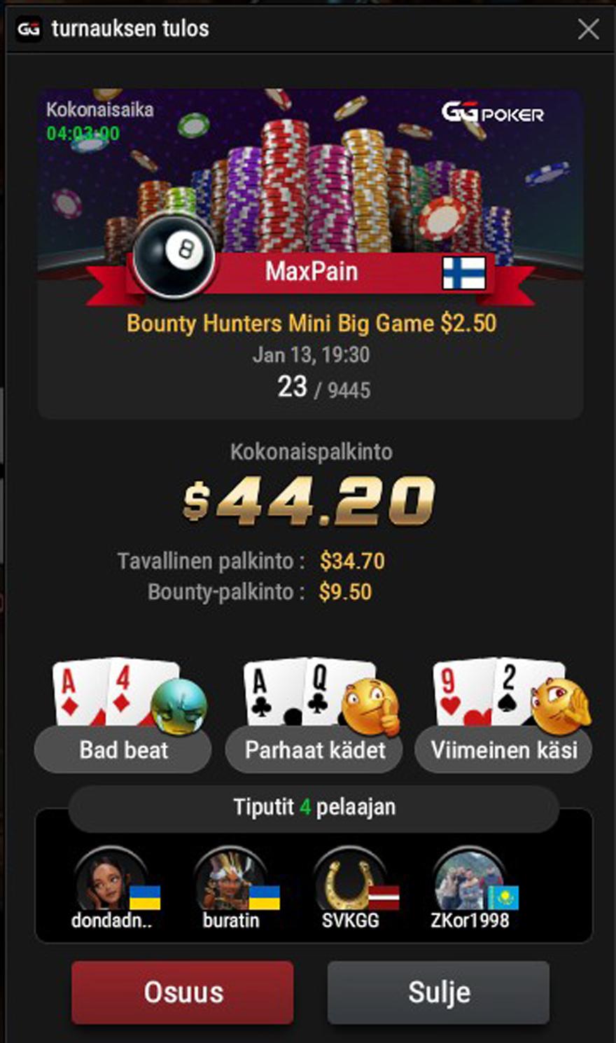 Olisha se nyt 10x helpompaa siellä taas rahastaa pienissä fieldeissä, mutta jotenkin näistä megäfieldeistä nauttii enemmän ;) Aina tainnut niin olla. Toisaalta näissä aika hauskaa, vaikka 1% joukkoon pääset jostain 10.000 pelaajamäärästä ja saat jonkun kympin siitä. Eilenkin sinne 50 sakkiin jostain 4k määrästä, tuliko jopa 15$ ;) Se ois päästävä sinne Top3 tai jotain.