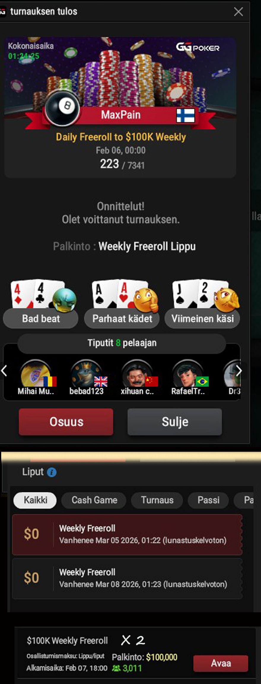 Jostain napsahti kolme karsintalippua 100k freeroll finaaleihin. Näistä selvitin kaksi maaliin, eli luvassa hyviä ”ilmaispelejä” 100k C$ pelin muodossa