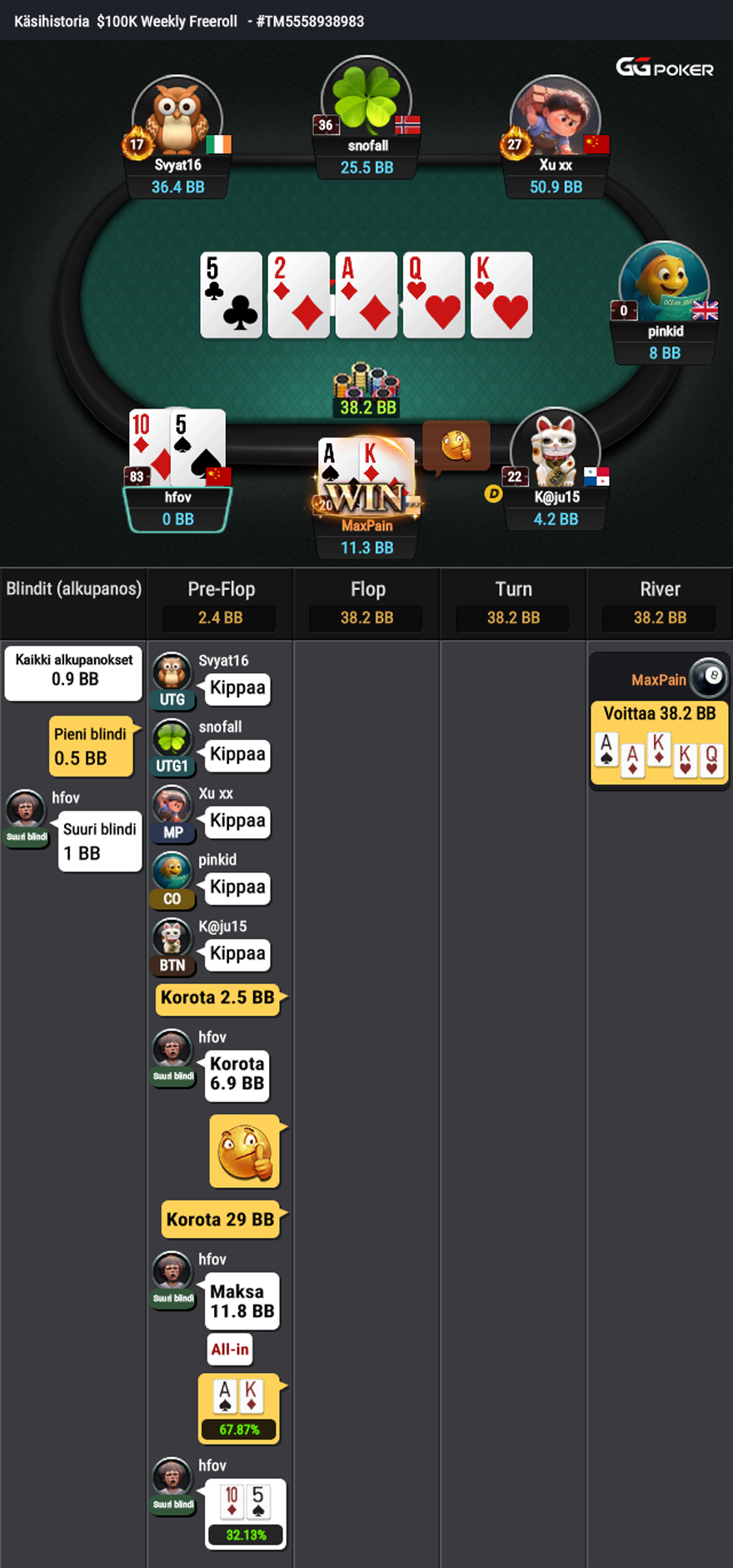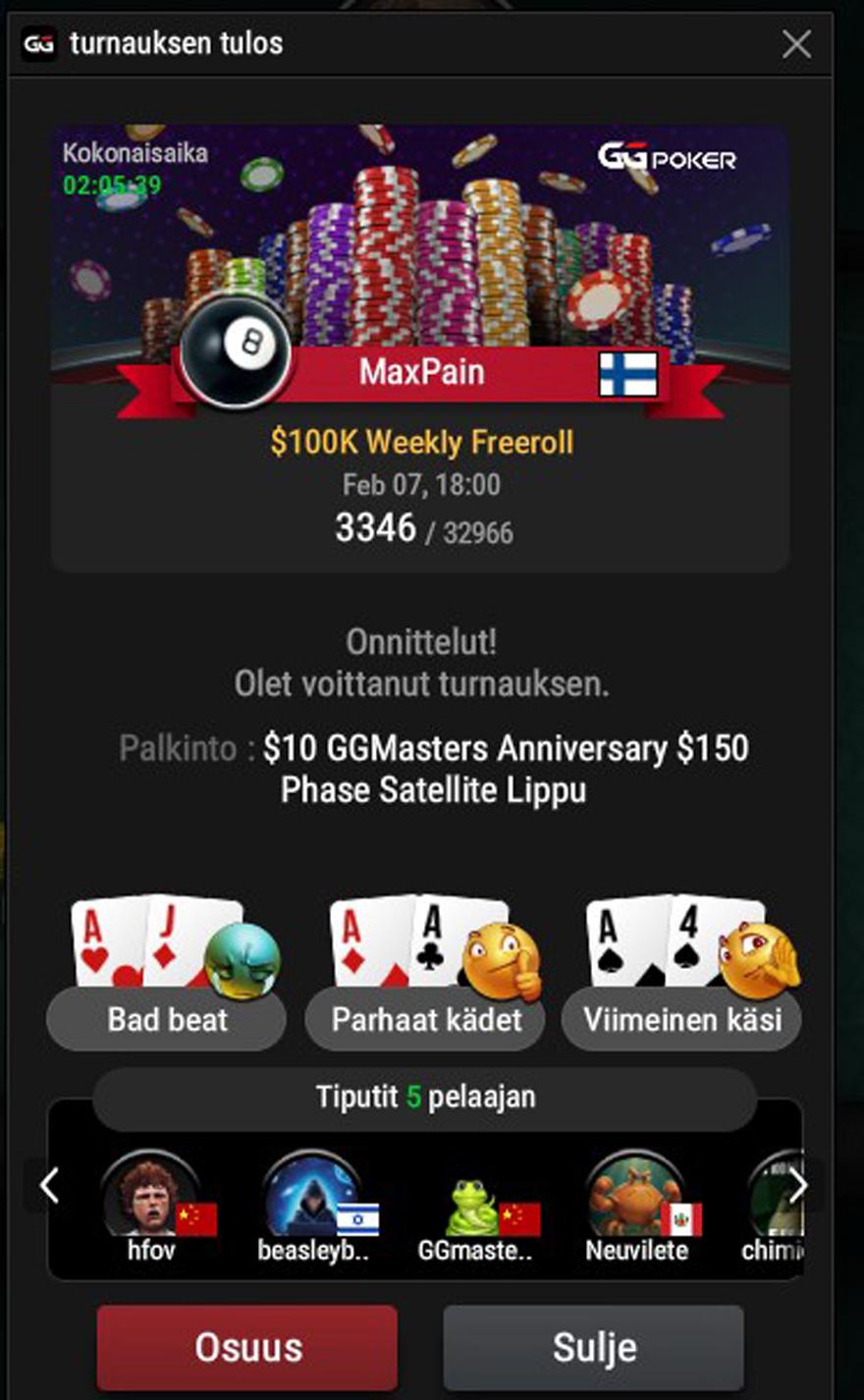 PokerBeatOsallistujaTuli toinen näistä voitetuista Freeroll lipuista pelattua. 33k pelaajan kera ;)