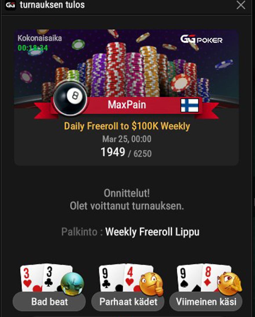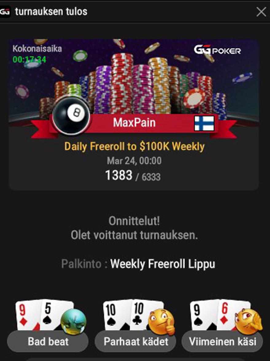 PokerBeatOsallistujaKiitos taas! Hyvät Streemit oli! Melke 8h! huhhuh