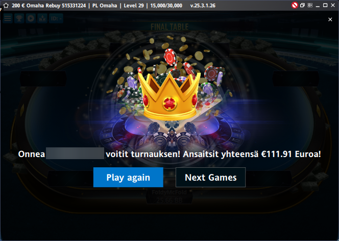 3r plo back to back kannuIllan toisen kannun tarjoili pikku mystery booty, joka meinas mennä jännäks. 3 left meillä 90bb vs vihujen 20bb ja isoin, reilun 70€ booty oli vielä pelissä. Sai tiputettua 3. sijalle tulleen ja isoin booty jäi vielä huppiin, jossa meillä 100bb+ vs 20bb. Nopeesti saatiin merkit keskelle ja kannu sekä bootyt kämpille