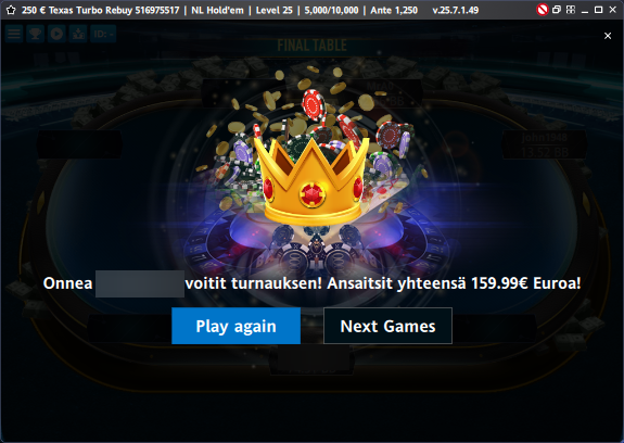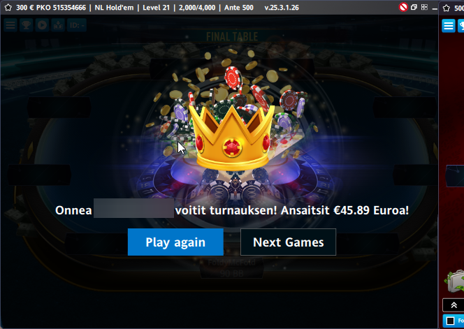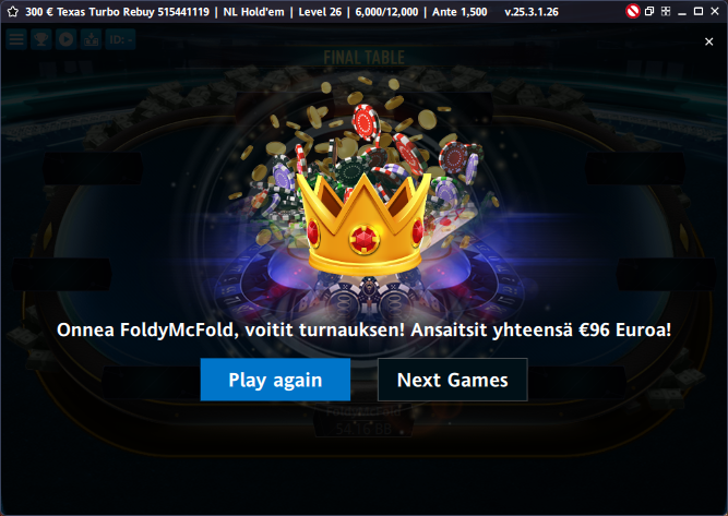 Heheh hyvähän se on hakee varmat pois :) Onhan nämä veikan pikkuturbot aika varianssi vapaata näppäilyä. Sen takia sitä kai nyt on pokereille paluun jälkeen tänne vähän jumittunut. Starsilla 180man turboja tuli pelattua 3r – 35$ useempi kymmenen tuhatta peliä ja spinnejä hieman enemmän, joten sitä kautta turbot jollainlailla tuttuja.
