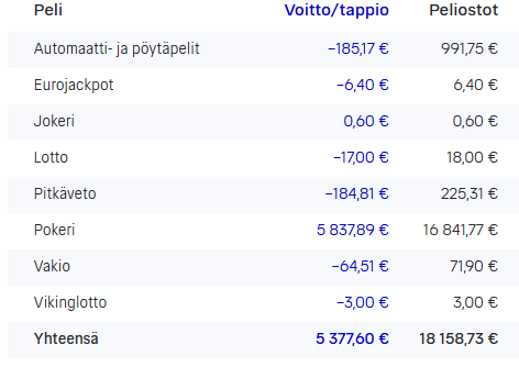 Veikalta saikin näppärän yhteenvedon vuodesta. Lotot ym tuli painettua lähinnä kimppoja työmaan tyttöjen kans aiemmin ja pokerit loppuvuodesta. Sloteissa nyttemmin rajat päällä ettei voi kuopata illan profitteja.