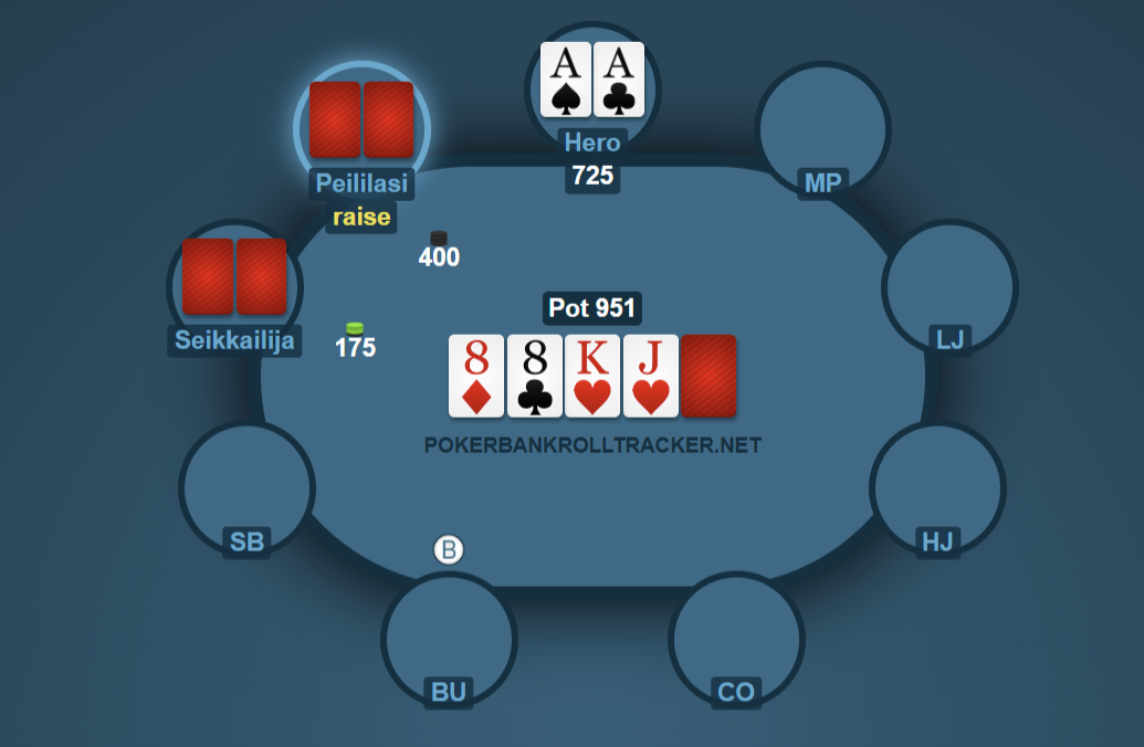 Peililasimies taas oli slaavi, jolla VPIP oli jotain 70 luokkaa ja kippaaminen tuntu ottavan aina vähän egon päälle. Otti muun muassa aikasemmin paistin flopin betin ja turnin shoven kiinni AQ:lla kymppikorkeeseen boardiin, vaikka mä oli vielä takana mukana.