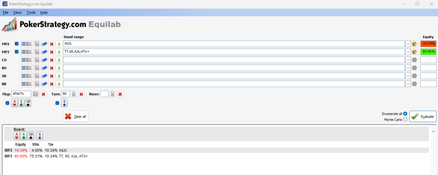 Flop on tottakai maksu, mut turn on se spotti mitä me täs halutaan opiskella. Et se menee flop merge (mutta usein tietyllä tapaa reaalikäsiin ei vetoihin painottuneesta rangesta turnin betsize polar rangeen). Tossa turnissa mietit intuitiivisesti että AJ voi vielä splitata valuen kanss tai siel voi olla ehkä joku A7o mistä tietää.