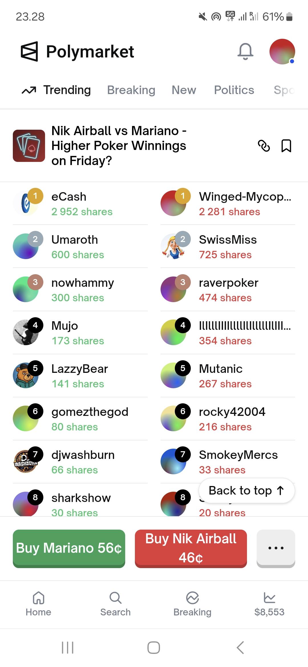 OsallistujaJa aika vaikee kontrolloida, et mitäs nyt top set nutsit ja 30k potti täytyy foldata et saadaan toi 3k tuolta polymarketista. Ei ne kaikki kuitenkaan vedä leikkirahalla ton polybetin 3k likviditeetin takia se alkaa mennä jo salaliittoteorioiden puolelle.