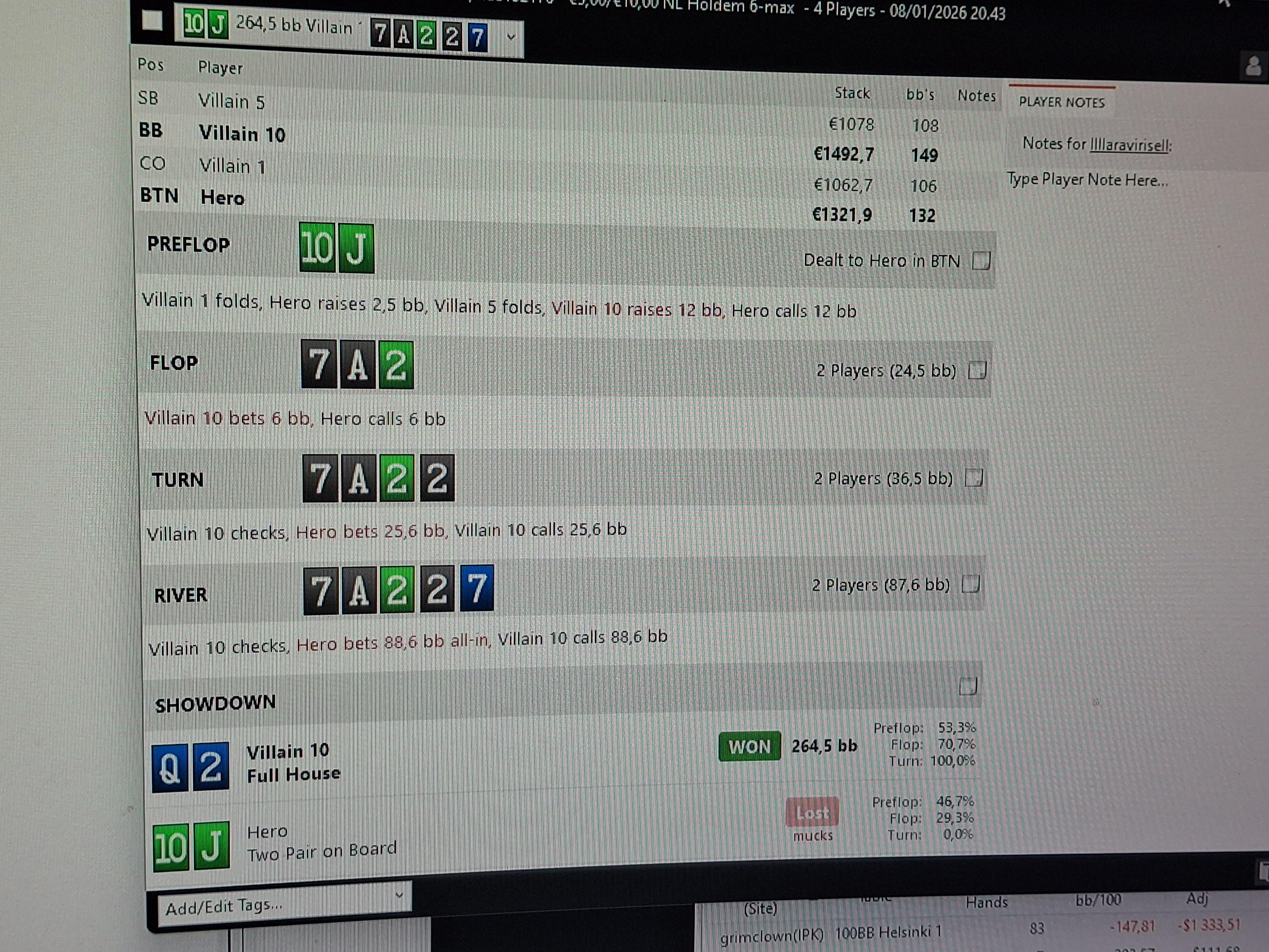 OsallistujaVaimo ja vauva oli hetken asioilla sai rauhassa pelata 1.5h session. Ei mulla tohon itkuun mene pasmat sekasin mutta jaksamista se vie kyllä. Sellanen 30% energiaa hukkuu huutoon parkuun jne ja syväajattelu heikkenee peli enemmän reaktiivista ja väsyneempää. Monethan tässä vaiheessa vuokraa toimiston tai keskittyy valmentamiseen, lol. Mua ei kiinnosta lähteä himasta mihinkään toimistoon ja kaikki pokeri on mulle suht vastenmielistä niin kierrätän vaan sitä et mitä pelaan, liveä jne. jos kokonaisuudesta sais 50k tänä vuonna niin hyvä olis.