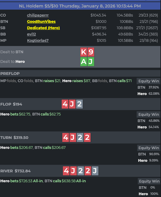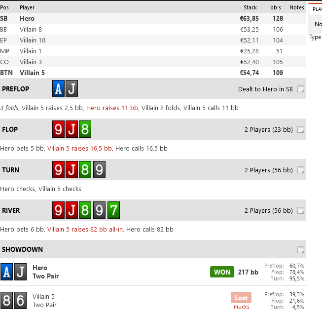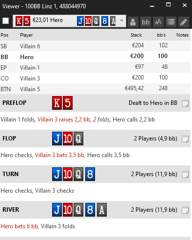 hyvä river kenelle? oop- tossa kt, kj kq k9 complete IP kun veti polar cbetin flopilta vaikee keksiä sille Kx – käsiä. KK . Varmaan spotti missä OOP laittaa joka kädellä just sen määrän bb:tä sisään kun mitä käden arvo about on ja bluffaa kaikki parinsa. IP range painottunee jonnekin AQ, QT, TT, QQ kaksiin pareihin. 9x haluu blockbetata ja se on ohkasin OOP reaali mikä haluu lyödä eli 50% lyönnillä korkeella suoralla splittaan tossa rangea. Tuskin se iso virhe on, mut varmaan blockbettiin pitäis riveri simplifioida.