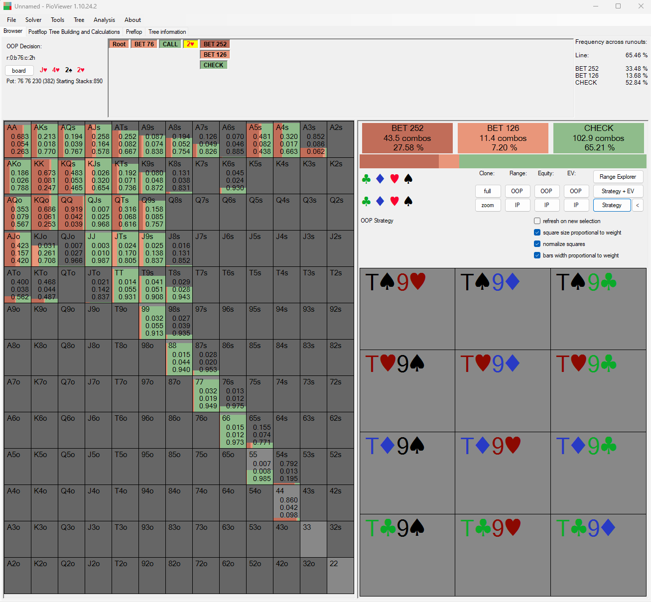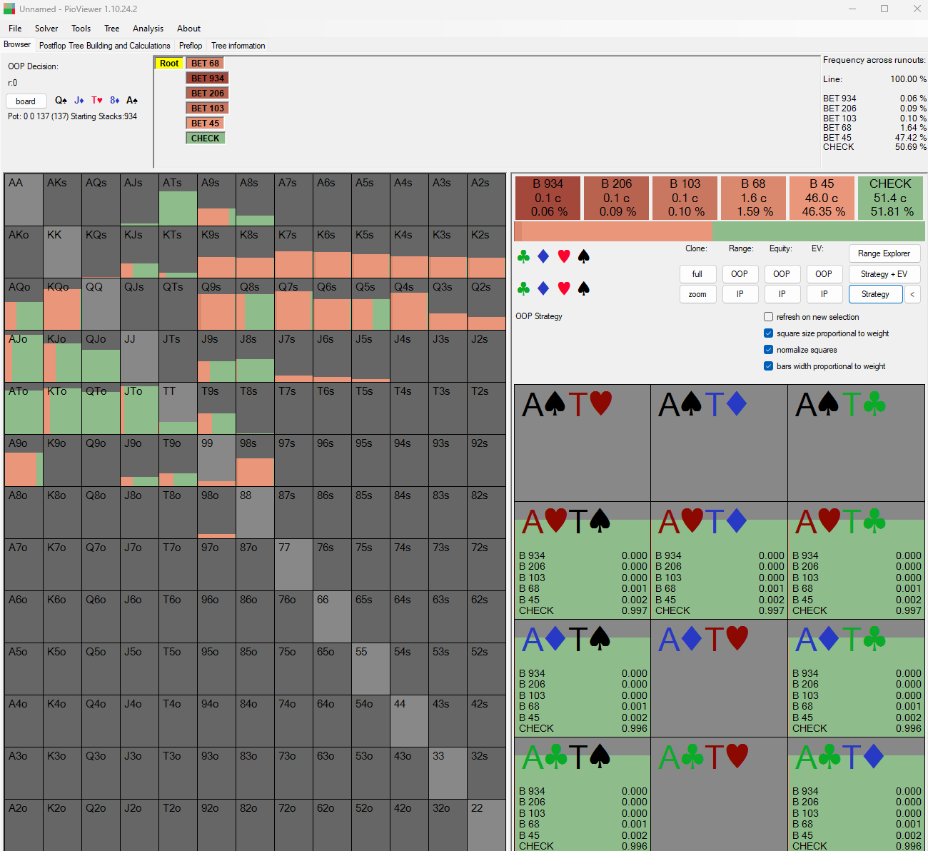 OsallistujaUnohtu 50% bet optio eli rakennettiin riveriin subtree vielä sillekin. EV sama jos lyöt 50 tai 30 mut solveri vaan blockbettaa tyypillisesti tollaseen suora runouttiin mis alempi suora haluu ehdottomasti sen blockbetin. Korkee suora silti OOP:lle hyvä. OOP:ta suosiva river spotti selkeesti.