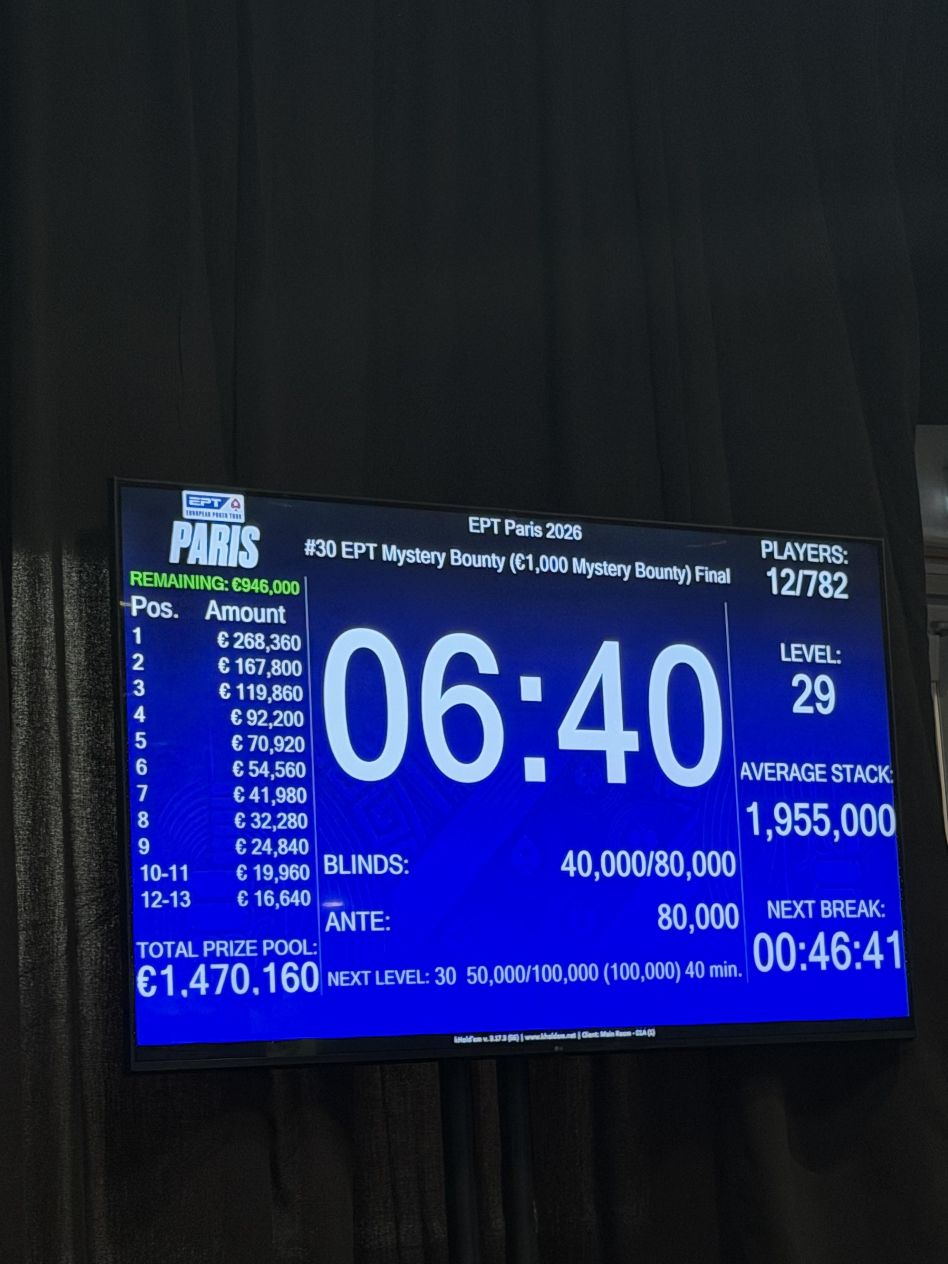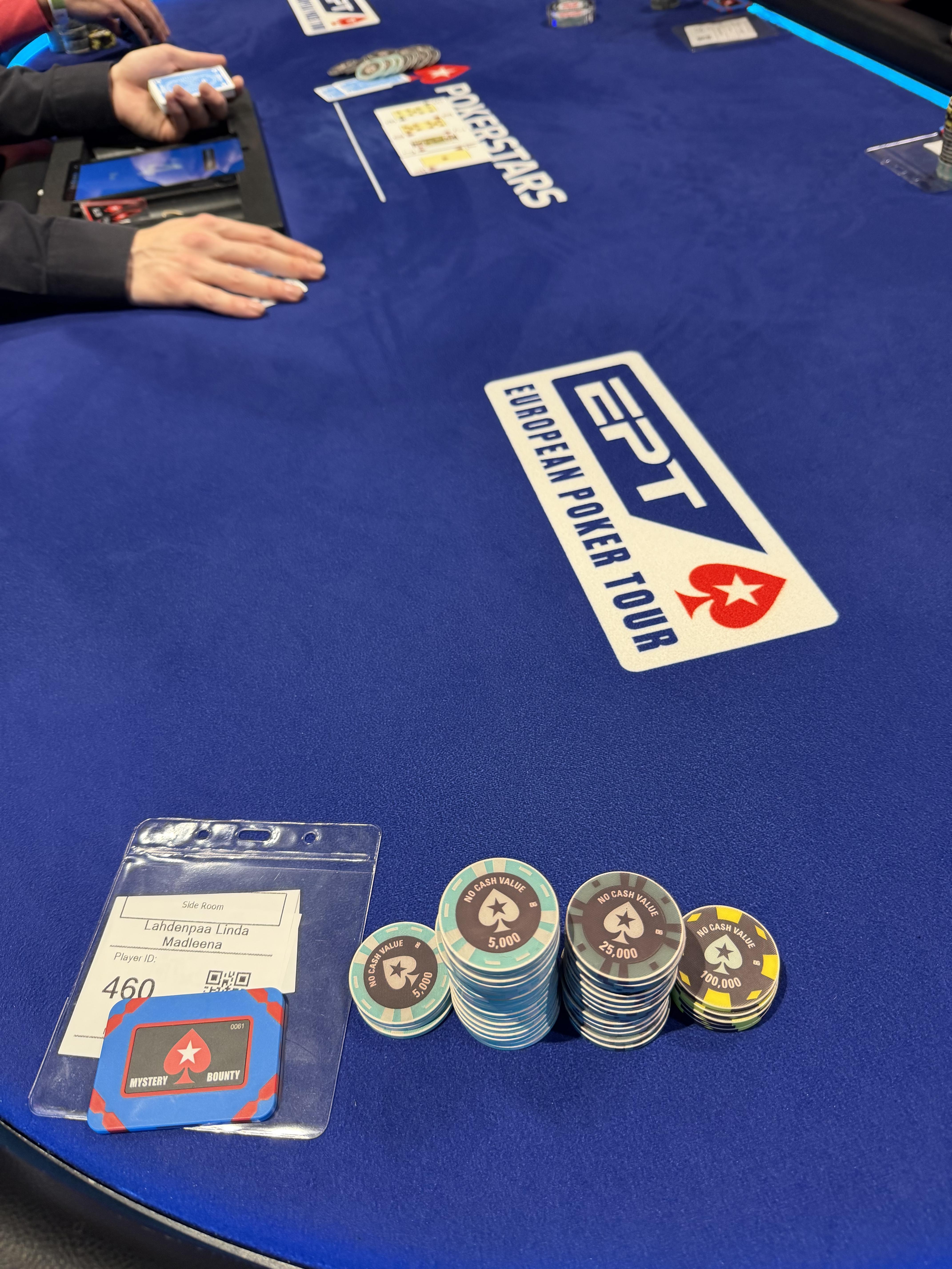 Tällä hetkellä oon EPT Pariisissa 3 250€ Mystery bountyssa runnaillut aika pitkälle.