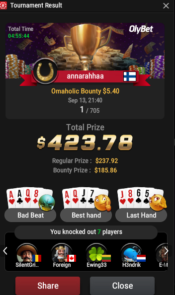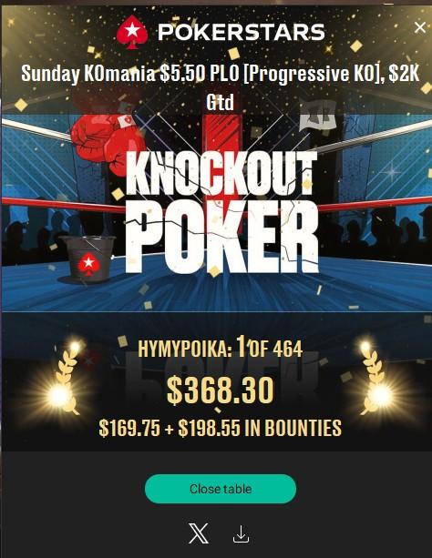 nasujOsallistujaKyllähän se yöllä harmitti ja melko bad beat itkua tuli, mutta hyvä saada purettua johonkin.