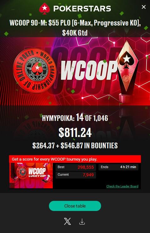 Niin lähellä mutta niin vitun kaukana. Ei kyllä lohuta tällä hetkellä yhtään. Top 2 ku 20 left. Sitte tulee megapaistiksi osottautunu Kahibill ja painaa eka T663ds pf 3bettiin mun utg avausta vastaan. Mulla AJ87ss. Flop 765, painan alle vaa kaikki. Sen jälkeen maksaa koko 35bb:n stäkkinsä pf A996ds. Voittaa toki.