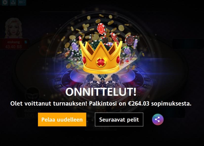 Rare diili coolilla. Ei yleensä tuu otettua, mut tässä tilanteessa tuntu hyvältä. Kolmoselle 150 ja voittaja 330. Mul oli 70bb, 2. 40 ja 3 joku 37 nii kyllä sama oli nyt seiftaa.