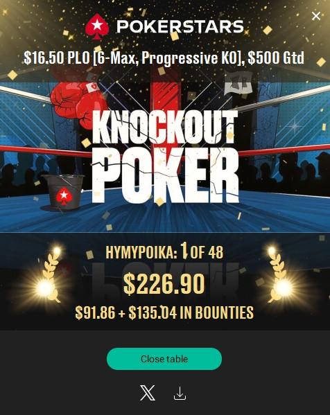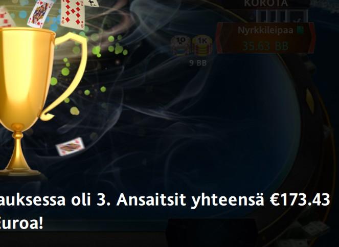 Yksi kappale tämmöisiä. Muuten vähän hiljaisempaa. Texu turneessa päästiin tosin sijalle 11. Reilu kilon pytty houkutti jo, mutta sitte menin ampumaan täysin laukalle päässyttä Dobbyä vastaan CO vs SB 14bb tasku femmoilla. Tällä kertaa oli AQ ja turnin naula pysäytti meikäläisen matkan. Tuota ennen joutui tekemään ikävän river foldin ja se käsi maksoi paljon. Lähellä ei lasketa. Kaipaisi kyllä jo nelinumeroista cääshiä. Ei ole taas hetkeen näkynyt.