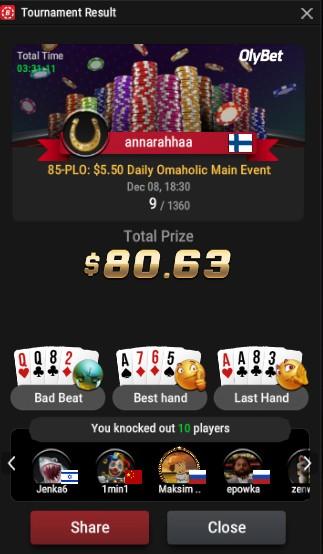 Tsemejä oli kyllä paljon, mutta perus hyytymiset. Starssin 22d oli lähellä hiipiä vuan T94ddx flop kärkisetti vs KK63 3 ruudulla turpiin 70bb pottiin sub 70 left eikä siitä enään toivuttu.