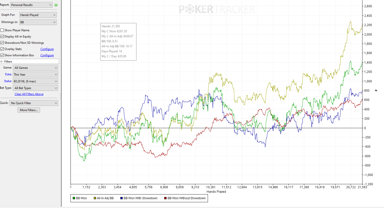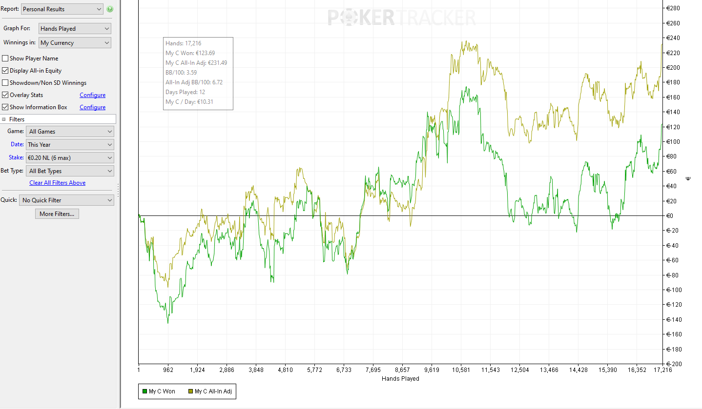 Mutta nyt homman nimi on suhteellisen simppeli: pelata 100 000 kättä Veikan NL20 winratella 12+ evbb/100. Jos tavoite ei täyty tuossa ajassa, niin sitten jatketaan pelaamista kunnes evbb/100 tavoite täyttyy haasteen alusta alkaen. Jos onnistun jollain ilveellä EV upittamaan 150 stäkkiä eli 3000 euroa ennen kuin tuo 100k käden volyymitavoite on täynnä, niin sitten keksitään joku uusi haaste isommalla/isommilla tasoilla tai jäädään nauttimaan eläkepäivistä.