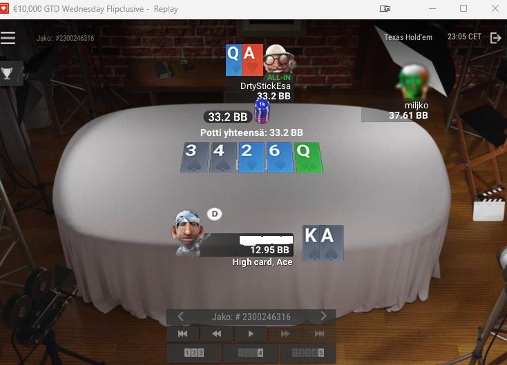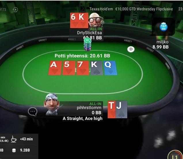 OsallistujaVoiskohan Unibetille olla jotenkin päätynyt semmoinen bugi, että hexaprossa ei jaeta lähtökorteiksi tällä hetkellä ollenkaan taskuässiä? Siellä on nimittäin promo, että pitää voittaa käsi hexassa nauloilla ja 6-tablasin niitä just 2 tuntia 40 minuuttia enkä saanu kertaakaan ässiä enkä nähnyt, että kukaan muukaan ois saanu. Tossa ajassa tulee karkeasti arvioiden joku 2500 kättä ja siinä ehkä vajaan tuhannen kohdalla aloin asiaa ihmettelemään ja laskin siitä eteenpäin mulle jaetut isot parit niin mulle jaettiin siinä ajassa 6 x TT, 7 x JJ, 6 x QQ ja 8 x KK. Eikä siis kertaakaan ässiä ja outoutta lisää se, että en nähnyt kyseistä kättää kenelläkään muullakaan koko aikana. Yritin hieman pyöritellä todennäköisyyksiä niin ei kai toi enää voi mennä varianssin piikkiin kovinkaan todennäköisesti? On se varmuudella ainakin alle 0,1 prosenttia. Jos joku on pelannut tänään Unibetin promoja ja yrittänyt voittaa käden hexaprossa ässillä ja onnistunut siinä niin vahvistakaa mun epäilys vääräksi. Mä en suostu nyt oikein uskomaan tätä ja jatkan vielä jonkin aikaa yrittämistä koska ne hexat kulkee plussalla kuitenkin ja xp-pisteraceen kertyy ihan hyvin pisteitä kans.