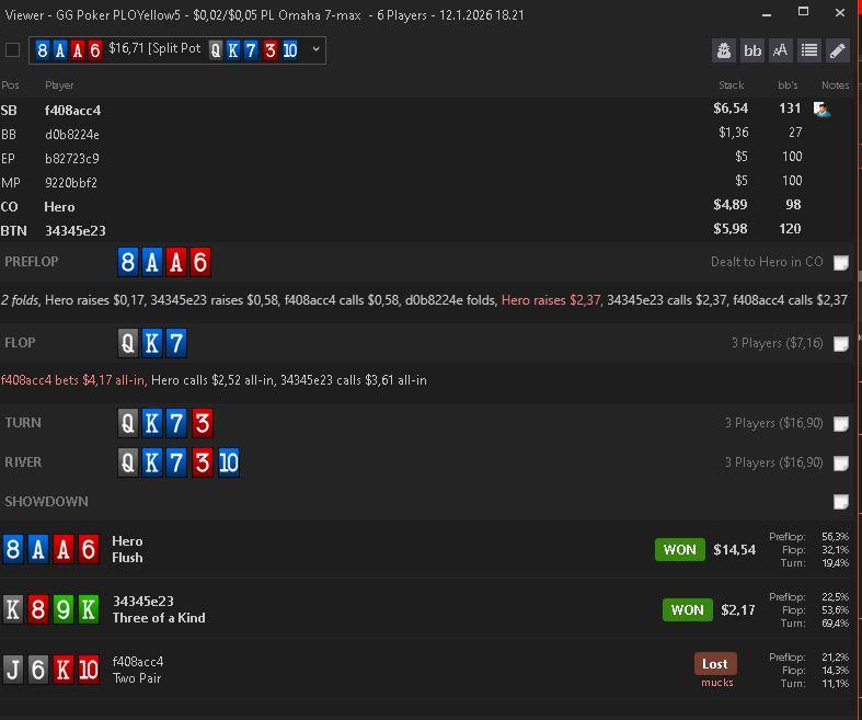 Aluksi riittää, että käy omaha calculatorin kanssa yleisemmät flop-combot läpi tyyliin: A-värin veto + gutari + takanoven väri, paljastetut naulat, meillä kärki+2 takoven väriä jne. Opettelee nuo, ettei tee ev- foldeja tilanteissa, jossa merkkejä on riittävästi keskellä, mutta se raha tehdään lopulta niillä pienemmillä poteilla, joissa kellään ei oikein mitään. Ole se, joka potit voittaa lyömällä tai reraise bluffilla. Lisäys. annan tässä vähän turhan yksinkertaisen kuvan ja pelin oppii pelaamalla. Erilaisia juttuja on lukematon määrä, jotka pitää vain tajuta itse. Yksi tärkeimmistä ja vähän advanced on vihujen laittaminen käsirangeen, joka voi tuntua 4-5 kortin pelissä aluksi mahdottomalta ja osittain sitä myös on, mutta opit kyllä löytämään tiettyjä säännönalaisuuksia vihujen pelistä ja käsistä. <20% vpip vihut voi suoraan laittaa keskipötkö tai yläpään kortteihin.
