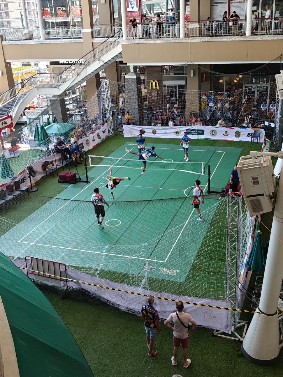 Market Village -ostoskeskuksen pihassa pelailtiin turnausta jossain ”jalkapallotenniksen” tapaisessa lajissa. Ihan mielenkiintoista seurattavaa oli: