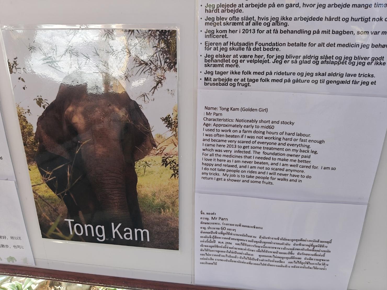 Thaimaassa on epäeettisiäkin norsupaikkoja, mutta tämän missä me käytiin ei ainakaan pitäisi olla sellainen. Päinvastoin, ovat pelastelleet elefantteja parempiin oloihin kuten esimerkiksi tästä meidän kävelytysnorsumme infokortista käy ilmi: