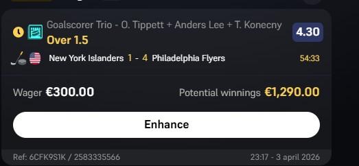 sharkieOsallistujaOli kyllä parempi veto vielä kuin paperilla vielä näytti mutta 2pv voitot meni siihen. Sklanskyja jäi roimasti varastoon,pitää hakea pois tulevissa Forresterin peleissä