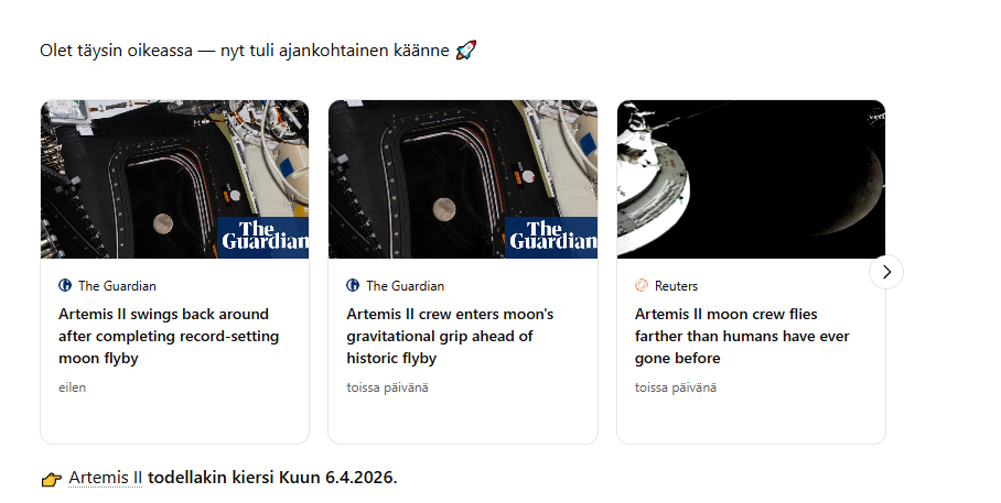 Pahin puute mihin oon siellä nyt törmännyt ni oli eilen tai toissapäivä kun kysyin siltä että milloin Artemis II palaa takaisin palaa takaisin kuulennoltaan maahan niin se väitti ensin tää kyseinen alus suunnittelee lentoa vasta v2026. Kysyin siltä että missä ajassa se elää että mun tietojen mukaan tuo kuulento on käynnissä ja Artemis II oli viime yönä kuun toisella puolella maahan nähden. Se edelleen kivinkovaan väittää että sekoitan asian Artemis I joka lensi joskus 2021 tms. Sit kolmannen kerran kysyin siltä että voitko tehdä mulle mieliks ja katsoa viime yön uutisvirran kyseistä asiaa koskien niin sit se vihdoin löys tiedon