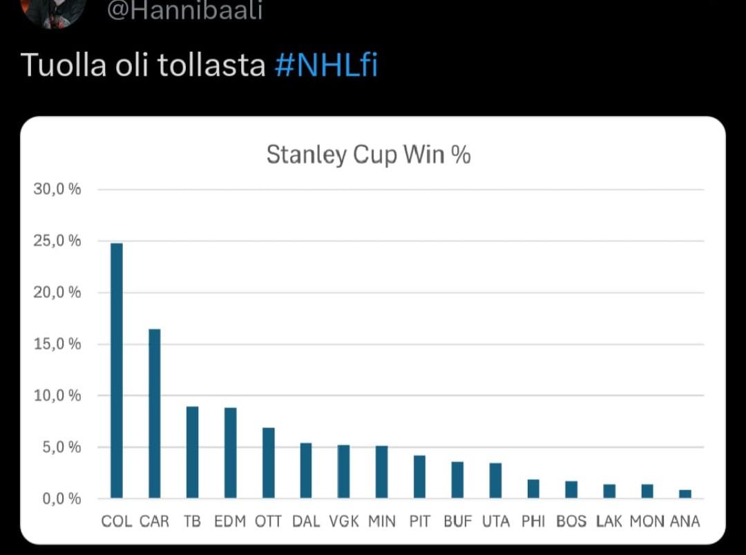 En kyl tajua vieläkään kuka löis Carolinaa pyttyyn ja miten Montreal on näin aliarvostettu. Niil on tyyliin nhl paras veska ja ykköskenttä. Ok kakkonen ja pätevä kolmoskenttä. Pakit on ehkä se heikko lenkki moneen verrattuna mut en kyl noin alas sais arvioissa. Mut en olekkaan kyllä nhl ammattilainen. Habsilla toki Tampa heti kärkeen vastassa mutta kaverin arvioilla noi 30x ei edes lapulle