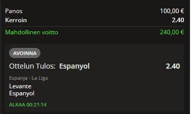 MrMoonin tipsillä rollit kii tähän. Vedolla saa 20e freebetin huomenna