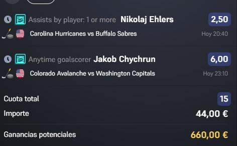 Heräsin just. Oli Jarvis maali lapulla tohon ekaan peliin mut vaihdoin sen Ehlers syöttöön. Aattelin et toi on se lapun varma kun odotin tohon peliin paljon maaleja. Olivat nyhränneet 2-1 voiton toki Jarvis osunut Ehlers sijaan. Sit toi 6x kertoimen haku Chychrunnanut taas maalin