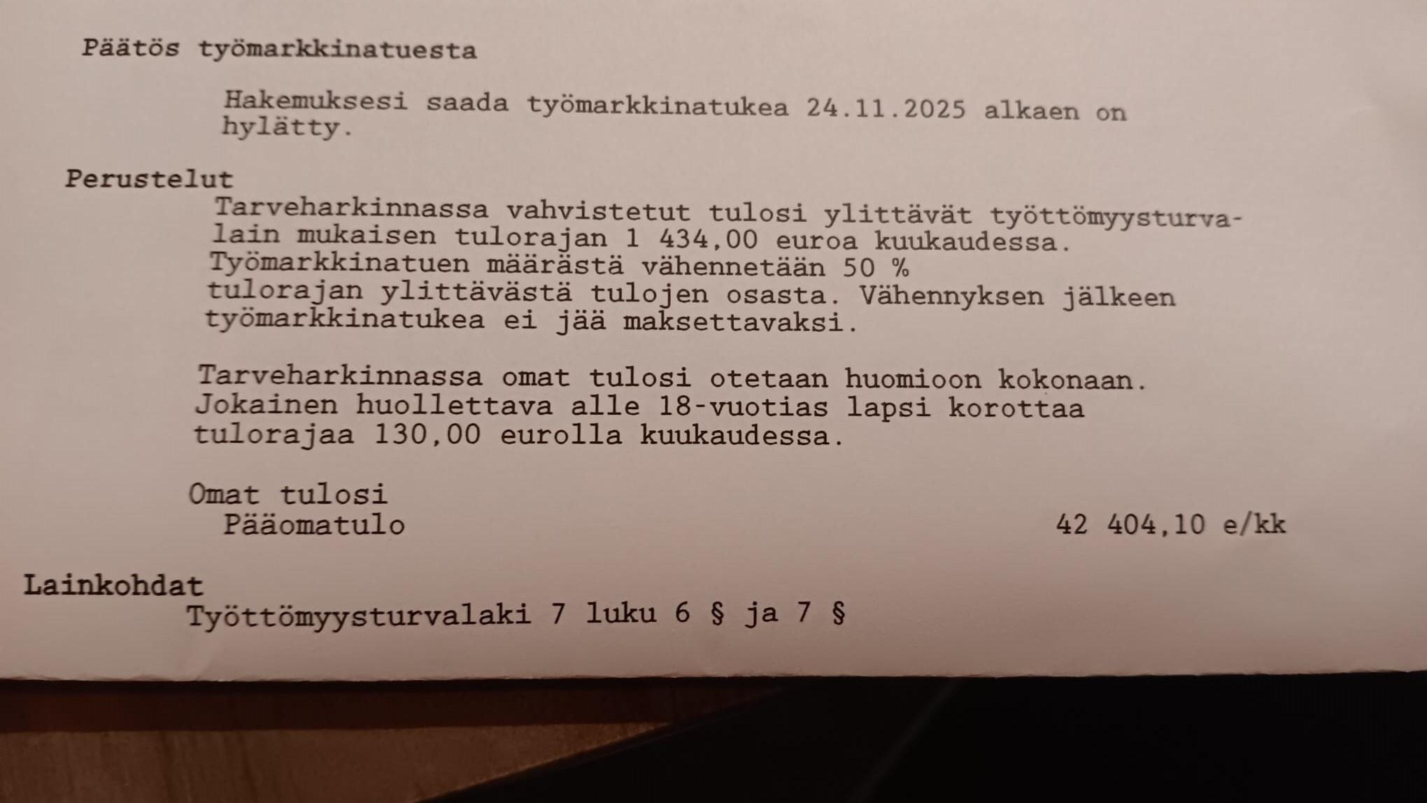 Lokakuun lopussa kun jäin työttömäks ni eka työkkärin kanssa tappelin ees taas kirjeenvaihtoa siitä oonko oikeutettu työmarkkinatukeen noiden viime vuoden pääomatulojen takia. Lopulta sain niiltä Kelalle puoltavan lausunnon tuelle mutta sitten alkoi tappelu Kelan kanssa samasta asiasta ja nyt sit lopulta tuli päätös joka kielteinen.