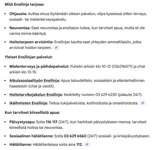 Siis toi ei oo mikään peluuri vaan tollai ensilinja missä voi jutella kaikista mieltä painavista asioista. Pidän ne asiat kyllä siellä mikä painaa mieltä ja saa ammattilaiset arvioida tilanteen ja onko tarvetta ohjaa eteenpäin tms. Kuitenkin ois tärkee Pärinä-Mikasta päästä eroon ja palata ajassa aikaan ennen Tomaatti-Teroa vaikkakin vanhemmiten unen määrä myös luonnollisesti vähenee. Mutta mitä enemmän pärinä vähenee niin sitä työkykyisempi musta tulee. Tai näin ainakin uskon ja oon kyl valmis ottaan apua vastaan jos sellasta tarjotaan. Pelkkä puhuminenkin voi auttaa tms. En mä noista tiiä sen enempää.