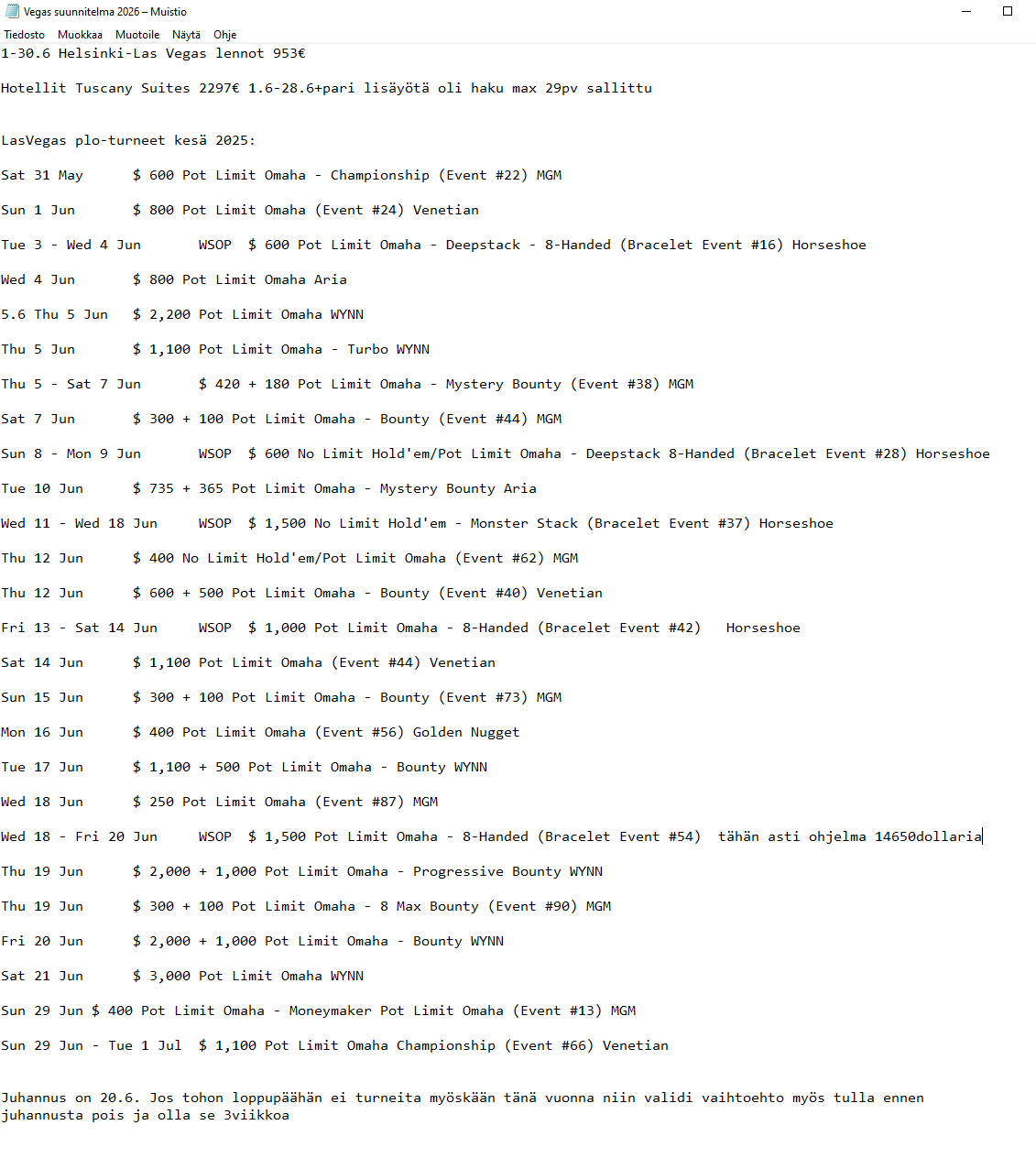 Tässä ois alustavan näköinen suunnitelma pohjautuen ohjelmaan mikä oli viime vuonna. Tuohon juhannukseen saakka ohjelma maksais 14650dollaria jos painais kaikki mitä haluan 1500dollariin saakka