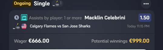 <p>kun tää osuu niin painetaan voitot Hutsun syöttöön. Siel on mielenkiintoinen peli Buffaloa vastaan niin varmaan tulee tossa sivussa reilattua</p>Ei onneks tarvinnut Hutsun syöttöö hakea