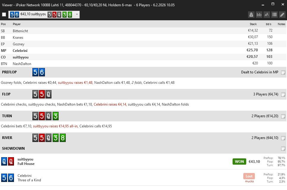 Tossa kun vihu cold callaa flopilla kun ensin checkannut ja action sille bet ja rr niin alkoi jo hälytyskellot soimaan päässä vaikka siellä ei 2h unien jälkeen ihan montaa aivosolua myöskään ollut hereillä. Turnilla eniten hukassa sizing kanssa jos halutaan edes lyödä. Jotenkin toi huus vaan itelle pähkinöitä. Jos vihulla olis A5s niin saattas suojella ja reissaa jo uudestaan jos ei olis jo cbetannut floppia ja hakenut valuee Q/värinvedot. Jos siellä olis slowplay AA niin se kävis järkeen mutta tulisko sekään yli sit turnilla(en tiedä miten gto tossa pelais esim) kun meilläkin on rangessa niitä QQ/5 vielä vai makselisiko se vaan päätyyn. En toki ymmärrä miksi se nytkään QQ painaa turnissa sisään kun saatan siihen vielä jotain pillejä foldaa. Toki nytkin ton action jälkeen oli silleen että saadaanko tässä edes sitä 18% equityy maksaa,pelaisko esim AQ ikinä näin.