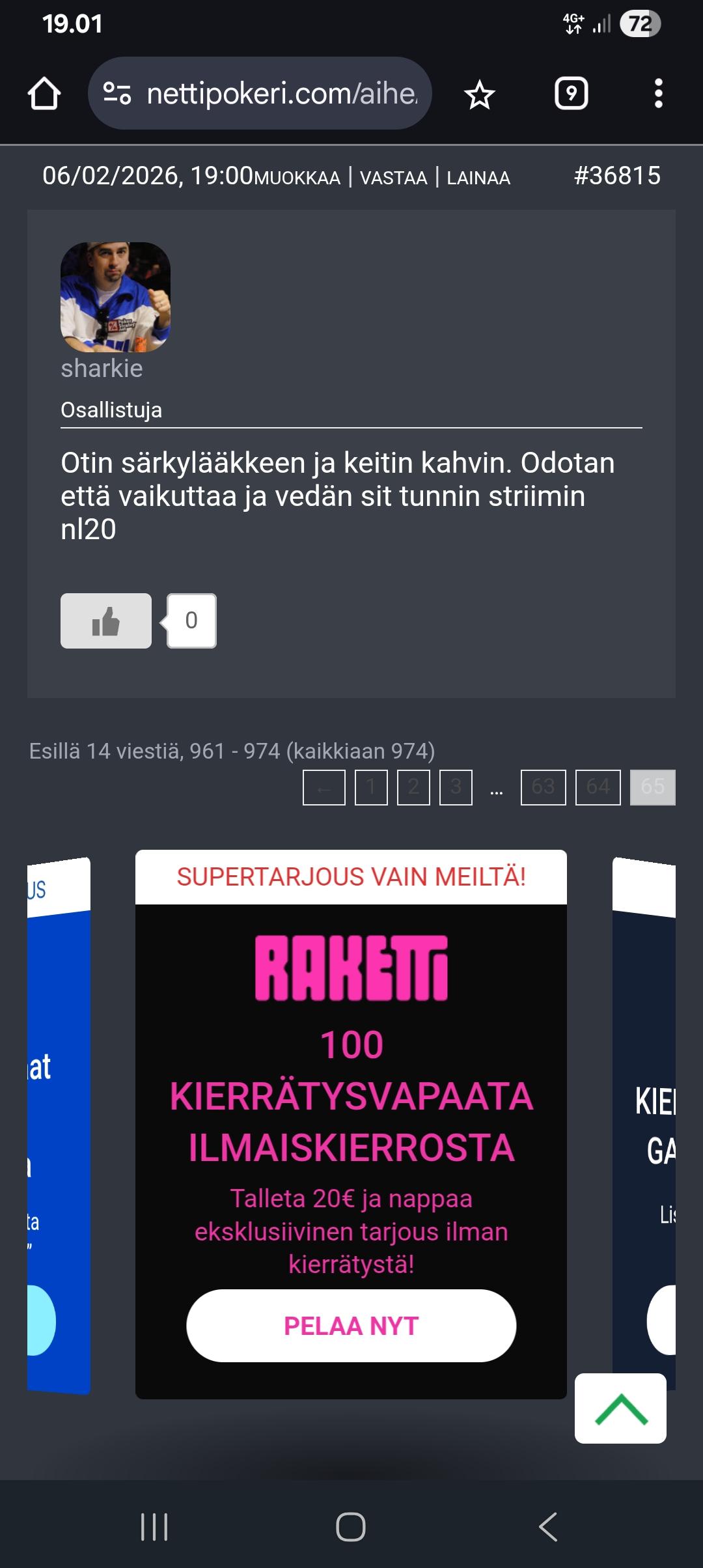 Striimi on käynnistä ketä se kiinnostaa,vedän 30-50min ennen saunaa https://www.twitch.tv/mikapaasonen