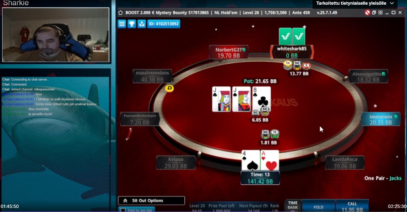 Bountyn metsästys joutu vetää ulkomuistista sillä softa näytti että kaikista oli vain 18e mystery jäljellä vaikka aukas softaa ja pöytää uusiksi. Muistin että ennen finua ei oltu jaettu vielä 400e bonitoa ja sillä strategialla sitten vedettiin. Ennen tätä päivää mun isoin mystery ikinä oli 80e winamaxilta. Sitten ennen finua sain 4way ai suoran ja sieltä 200e ja finussa sitten nämä