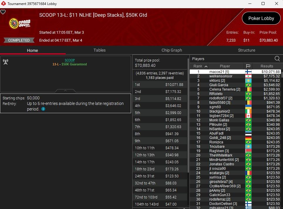 SCOOP 13-L: $11 NLHE