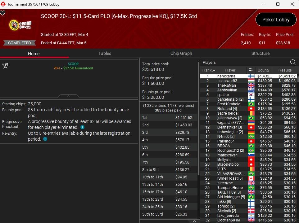 SCOOP 20-L: $11 5-Card PLO