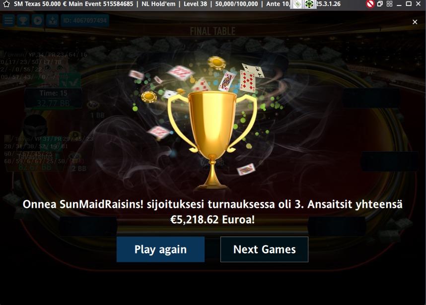 Maukkaan rahamäärän lisäksi näiden sunnuntaimajorien – pienempienkin – voittamisessa on jotain erityistä.Kakkospäivälle lähdettiin sijalta 12/12, siis hyvistä tarkkailuasemista. Aika lailla viimeisellä sijalla alkoi myös finaalipöytä. Mukavan struktuurin ansiosta sekin tarkoitti 20bb stäkkiä eikä kiirettä mihinkään. Parilla taidokkaalla ohivedolla (QQ > AA, AT > AJ) nousin keskistäkin tienoille, ja siitä olikin hyvä seurailla muiden pelaajien törmäilyä. 3 leftissä olin taas selvästi viimeinen, kunnes pöydän parhaaksi arvioimani pelaaja tippui kahdella peräkkäisellä biitillä ykköspaikalta ulos. Kaksinpeli aloitettiin sitten 30bb-130bb pinoilla vastustajan eduksi. Toista tuntia kestäneen kamppailun päätteeksi sain johtoasemassa merkit sisään AKo vs KQo. Kuin pisteenä i:n päälle jakaja tarjosi flopille rouvan ja riverille sielua hivelevän ässän. Olen tyytyväinen peliinikin (varsinkin heads-upissa), mutta kyllä tälle kakkospäivälle osuivat myös kaikki erilaiset hyvän runin muodot.
