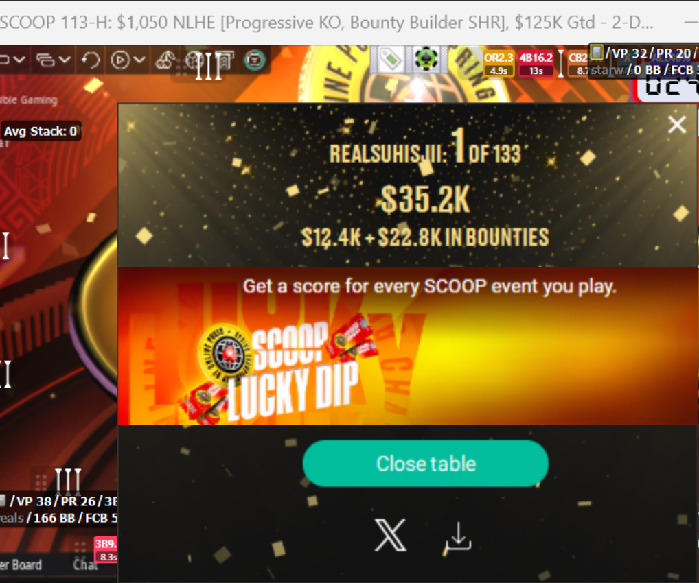 Scoopit menivät oikein hyvin. Yksi pyttykin tarttui matkaan. OlyBetillä tuli myös 600 taalan WSOPC-massamätössä kolmas sija. Hauska finaali, kun turnauksen voittanut Onni on tuttu jo Kuopion ja Jyväskylän Feel Vegas Pokeri ajoilta vuosien takaa. Onni pelasi todella hyvin, ja vaikka kerran cooleroin kaverin AA vs KK, ei ollut miestä pysäyttämään.