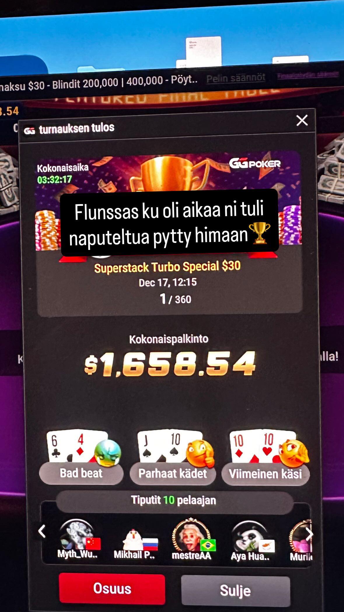 Tavoite alkoi eilen tahmeasti, kun sunnuntaiturtseista -220€. Tänään yks day2 ja pari muuta turneeta kylkeen niin katsotaan saataisko käännettyä.